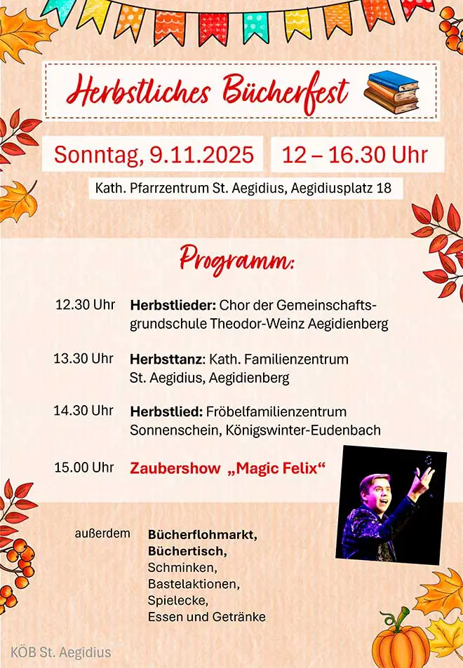 Bad Honnef-Aegidienberg. – Bücherfreunde, Familien und Kinder dürfen sich auf ein besonderes Ereignis freuen: Am Sonntag, 9. November 2015, lädt das Katholische Pfarrzentrum St. Aegidius (Aegidiusplatz 18) von 12 bis 16.30 Uhr zum herbstlichen Bücherfest ein.
