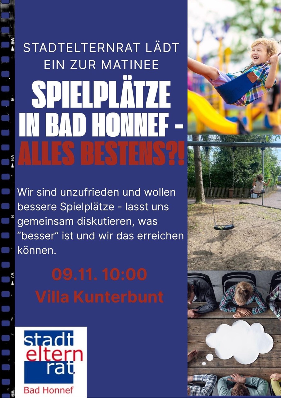 Bad Honnef – Unter dem Motto „Starke Eltern reden mit!“ lädt der Stadtelternrat Bad Honnef am 9. November 2025 um 10 Uhr zu einer Matinee mit dem Thema „Bessere Spielplätze und öffentliche Räume für Kinder und Jugendliche.“ im Familienzentrum (Luisenstraße 43a in Bad Honnef) ein.
