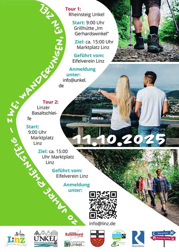 Unkel – Der 320 Kilometer lange Rheinsteig lockt jedes Jahr Naturfreunde an, die Weinberge, Wälder, Schlösser und die spektakulären Ausblicke entlang des Rheins erleben wollen. In diesem Jahr besteht der Fernwanderweg 20 Jahre. Städte und Gemeinden zwischen den Endpunkten Bonn und Wiesbaden feiern den Geburtstag mit Veranstaltungen, bei denen Natur, Familie und der Spaß im Vordergrund stehen. Die Städte Linz und Unkel reihen sich in die Veranstalter ein und laden zu ihrer gemeinsamen Aktion „20 Jahre Rheinsteig – zwei Wanderungen, ein Ziel“ am Samstag, 11. Oktober 2025 ein.