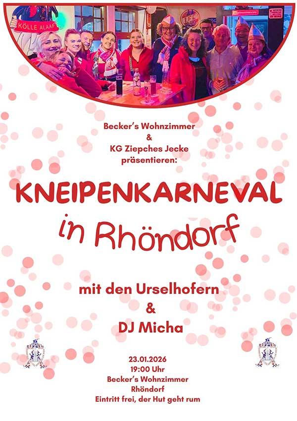 Bad Honnef-Rhöndorf – Am 23. Januar 2026 laden die KG Ziepches Jecke und Becker’s Wohnzimmer zum Kneipenkarneval in Rhöndorf ein. Ab 19:00 Uhr erwartet die Gäste ein geselliger, musikalischer und jecker Abend – bei freiem Eintritt.