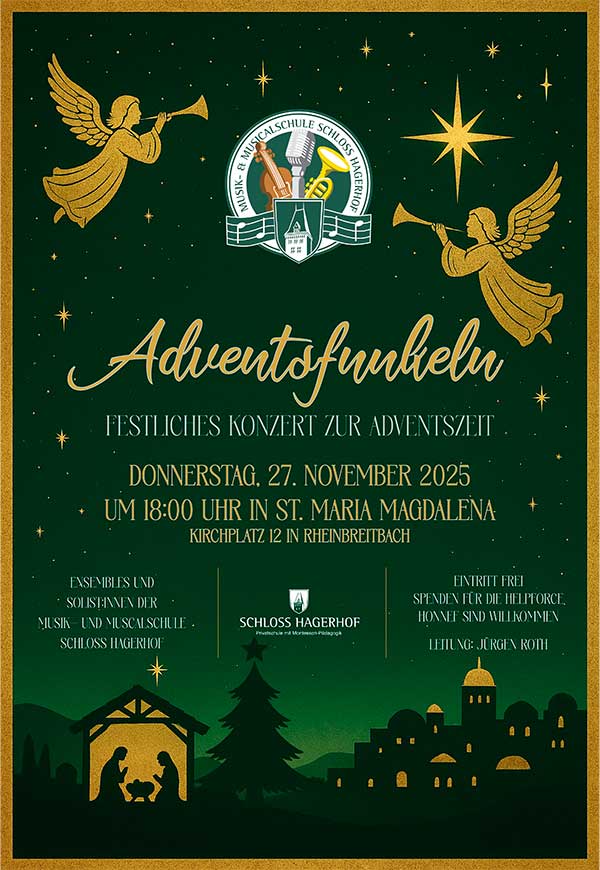 Bad Honnef – Unter dem Titel „Adventsfunkeln“ stimmt die Musik- und Musicalschule Schloss Hagerhof am 27. November in der Pfarrkirche St. Maria Magdalena in Rheinbreitbach auf die wohl schönste Zeit des Jahres ein. Orchester, Big Band, Chöre, sowie Solistinnen und Solisten bereiten einen zauberhaften Abend, an dessen Ende als Finale ein großer Projektchor aus Schüler:innen, Eltern, Lehrer:innen und Mitarbeitenden zusammen mit allen Ensembles auftritt.