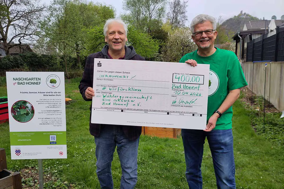 Bad Honnef. Erfreuliche Finanzspritze für den noch jungen Verein #WirfürsKlima e.V.: Die Wählergemeinschaft DIE GRÜNEN Bad Honnef e.V. unterstützt die Initiative mit einer Spende von 400 Euro. Michael Oswald, langjähriger Vorsitzender der Wählergemeinschaft, überreichte am Freitag im Naschgarten am Reitersdorfer Park einen symbolischen Scheck an den Vorsitzenden von #WirfürsKlima, Guido Düren.