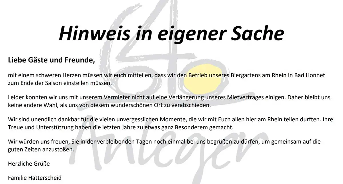 Wirt Hans Hatterscheid, seine Frau und seine Tochter zeigen sich tief betroffen. „Das Projekt Anleger 640 hat mir wahnsinnig viel Spaß gemacht. Ich habe alles versucht, aber der Eigentümer hat nicht mitgespielt“, sagt er. Neben der Familie trifft die Entscheidung auch weit über 20 Mitarbeiterinnen und Mitarbeiter. Er selbst wird sich nun beruflich vermutlich zur Ruhe setzen.