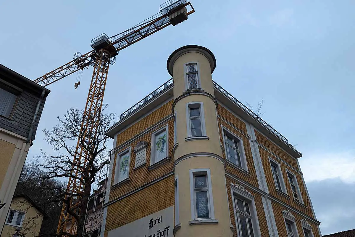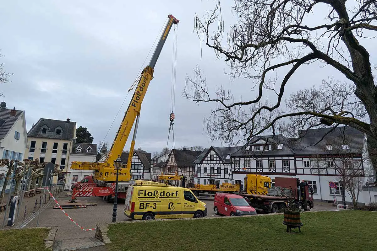 Ein ungewohnter Anblick bot sich den Rhöndorfern heute auf dem Ziepchensplatz: Für Bauarbeiten auf dem Gelände des Weinhaus Hoff in der Löwenburgstraße 35 war ein Kran erforderlich. Aufgrund der engen Straße musste er vom Ziepchensplatz aus mithilfe eines mobilen Krans ins Zielgebiet gehoben werden. Sechs Stunden dauerte der gesamte Vorgang – für Technikfans ein besonders faszinierendes Erlebnis.