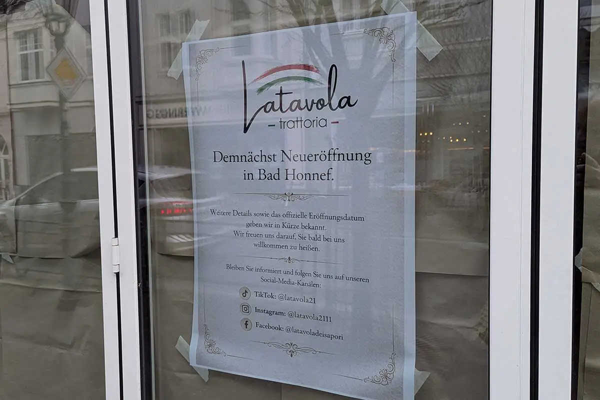 Die Geschäftsräume in der Bad Honnefer Hauptstraße 35, die offensichtlich ausschließlich für gastronomische Betriebe vorgesehen sind, bekommen einen neuen Mieter. Laut einem Plakat wird dort bald die Trattoria Latavola Speisen und Getränke anbieten. Die beiden Vorgänger machten einen eher unprofessionellen Eindruck und mussten ihr Geschäft nach jeweils wenigen Monaten wieder aufgeben. Immerhin erhielt Burgerliebe für ihre Burger gute Bewertungen. Die Frage bleibt: Warum funktioniert ein gastronomischer Betrieb an diesem Standort seit Jahren nicht?