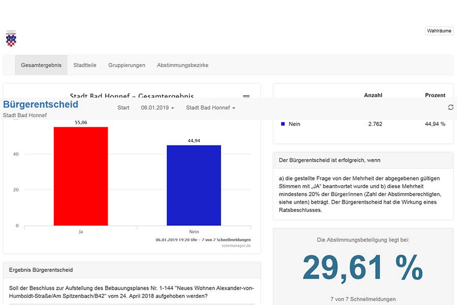 Bad Honnef. Der Bürgerentscheid über eine mögliche Bebauung des nördlichen Stadtgartens ist beendet. Die Frage lautete: „Soll der Beschluss zur Aufstellung des Bebauungsplanes Nr. 1-144 „Neues Wohnen Alexander-von-Humboldt-Straße/Am Spitzenbach/B42″ vom 24. April 2018 aufgehoben werden?“