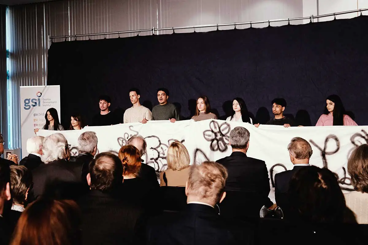 Im Anschluss präsentierten Schüler*innen der Bonner Abendrealschule einen Auszug aus ihrem Theaterstück „Der Bus des Lebens“, das beim Schultheaterwettbewerb der Theatergemeinde Bonn den zweiten Platz belegte. Es war ein hoch emotionaler Moment, in dem die Jugendlichen ihre Erfahrungen als Geflüchtete teilten und verarbeiteten. Das Stück thematisiert die Flucht aus dem Heimatland und zeichnet eindringliche Bilder von Krieg, Tod und Zerstörung. Im Saal herrschte völlige Stille.
