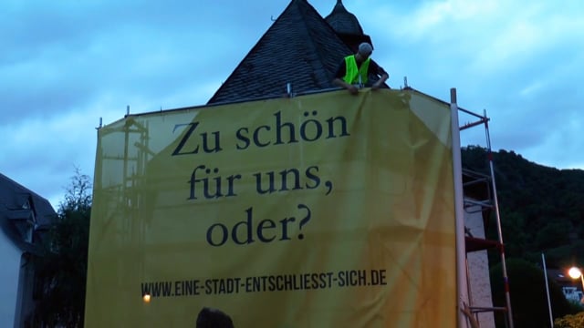 Bad Honnef-Rhöndorf | Während im Örtchen noch alles schlief, war heute in der Nacht an der Kapelle in Rhöndorf schon reges Treiben. Seit drei Uhr kümmerten sich zwei Bedienstete der Stadt und drei Mitarbeiter einer Werbefirma um den reibungslosen Ablauf der Verhüllung der Marienkapelle. Die Aktion bildet laut Pressestelle der Stadt den sichtbaren Startpunkt für die Einführung einer Dachmarke für Bad Honnef. Gestern wurde sie in wesentlichen Grundzügen vorgestellt.