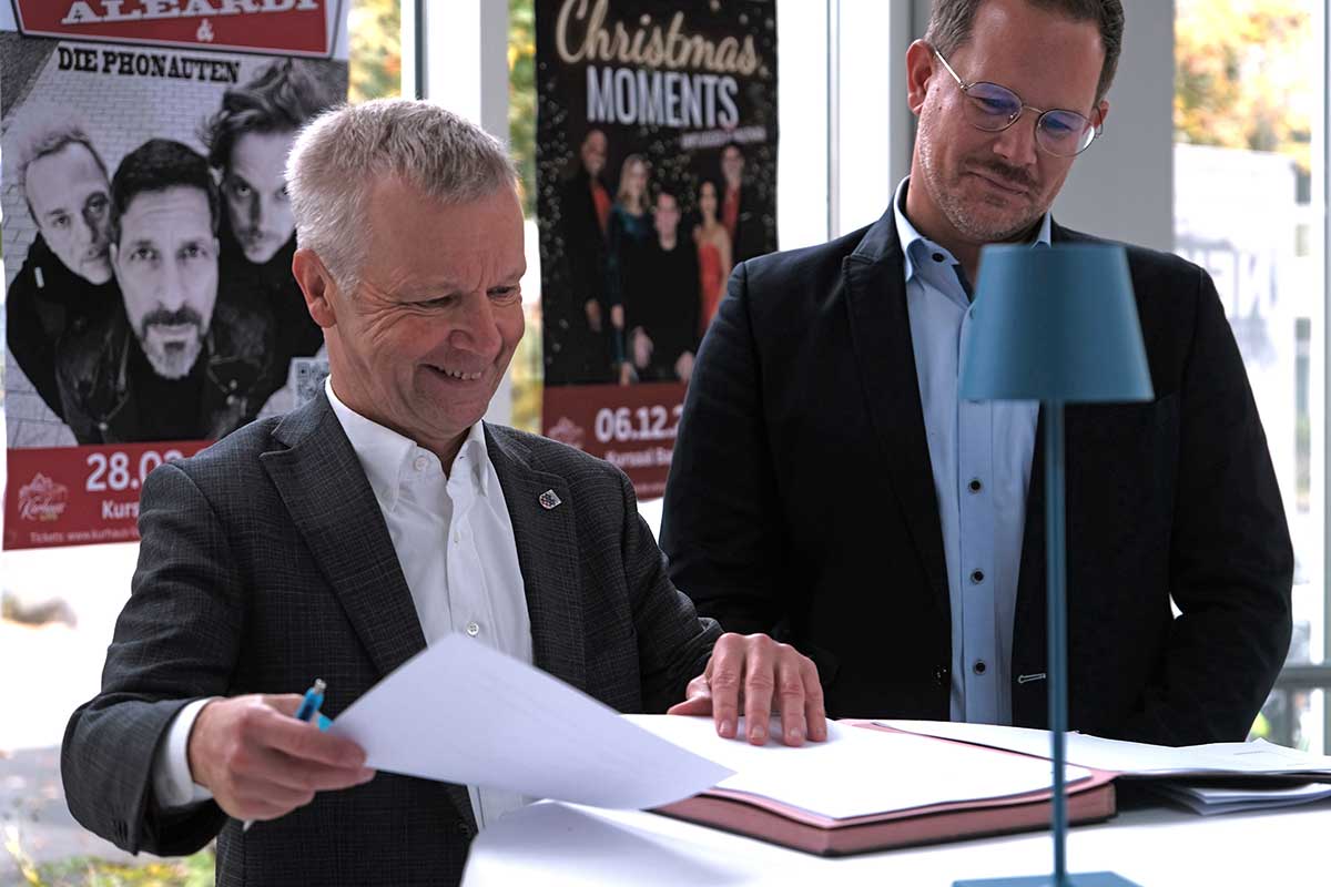 Bad Honnef – Am Mittwochvormittag stellte Bürgermeister Otto Neuhoff im Foyer des Kurhauses Bad Honnef offiziell den neuen Pächter vor. Der aktuelle Konzessionsvertrag mit der Firma Kirberg endet am 31.03. 2026 und die Betreiberschaft des Kurhauses musste neu ausgeschrieben werden. Nach einem längeren Auswahlverfahren, bei dem es verschiedene Interessenten gab, erhielten Wolfgang Stahl und sein Partner Daniel Reers den Zuschlag. Mit ihm und der neu gegründeten Kursaal Betriebs GmbH beginnt für das traditionsreiche Kurhaus ein neues Kapitel.