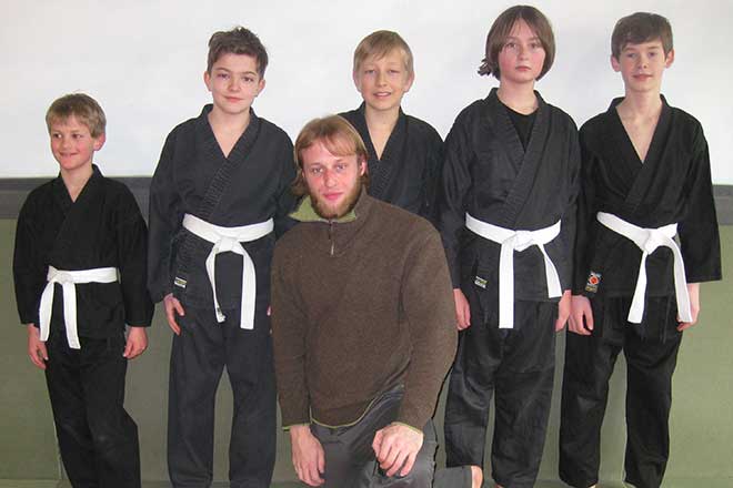 Die Prüfung zum Weiß-Gelbgurt bestanden: Florian Baltes, Jonathan Dohmen, Götz Klemme und David Koch; zum Orangegurt: Janek Bokelmann.