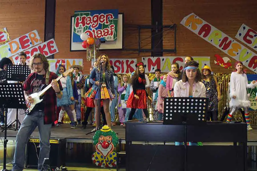 Bad Honnef-Selhof | Zum 7. Mal hieß es auf Schloss Hagerhof: „Mer fiere zesamme met d‘r janzen Schull!“ Schüler, Lehrer und Erzieher feierten gemeinsam Karneval in der Sporthalle, diesmal nach dem Motto „Tänze, Lieder und jecke Tön, Musik macht Karneval erst schön!“