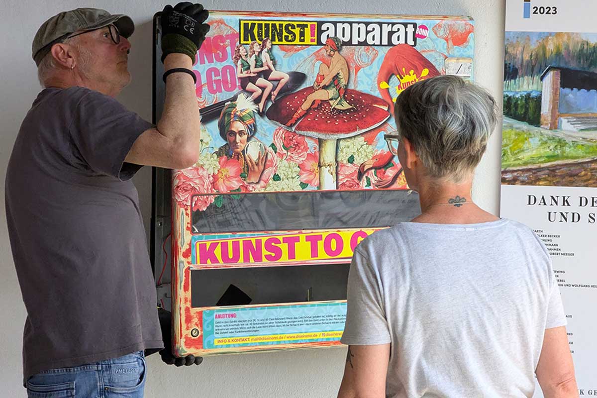 Doch dabei bleibt es nicht. Neben den Konzerten und dem Bücherschrank ist dort seit heute ein Kunstwerk zu bewundern: ein Kunst-Apparat. Geschaffen hat ihn die Bonner Künstlerin Nadja Schüller, deren Kunst-Apparate unter anderem in Königswinter und Bonn hängen.