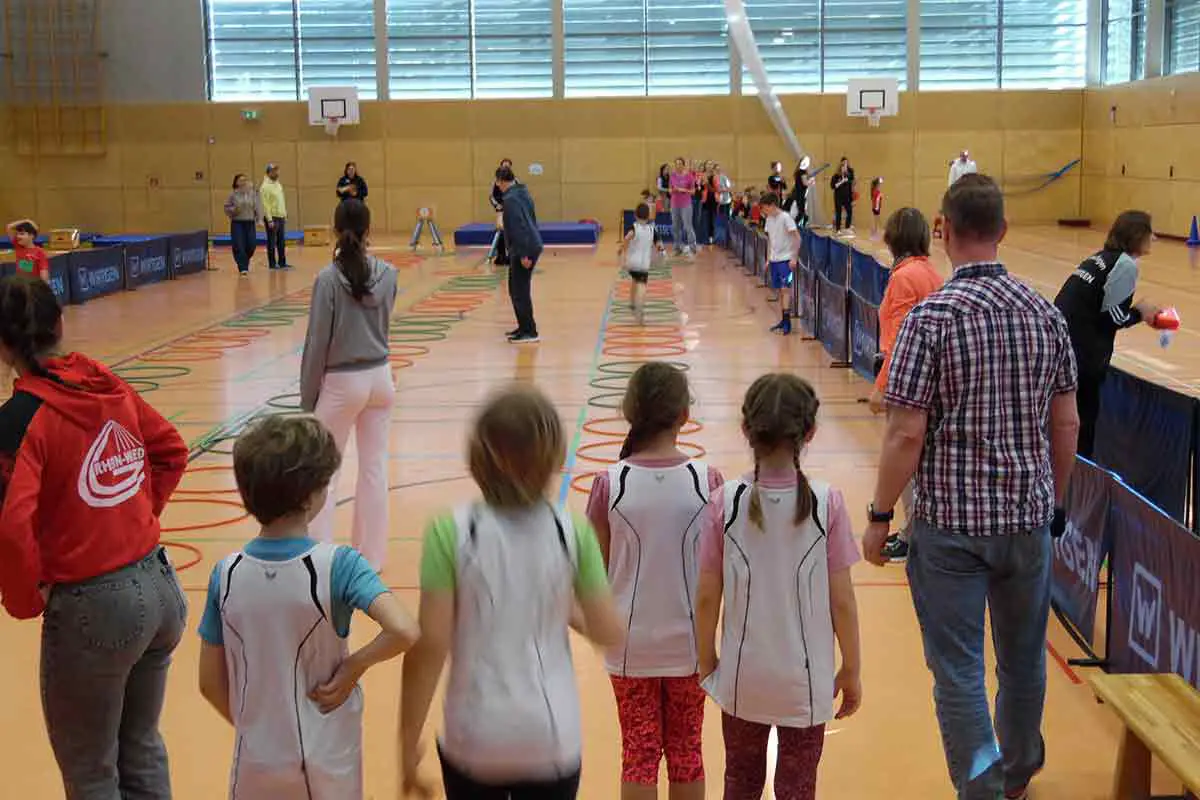 Tags zuvor wurde bereits die Halle mit den Wettkampfstationen vorbereitet, sodass die Wettkämpfe pünktlich starten konnten. Alle kleinen Wettkämpferinnen und Wettkämpfer, die in den Altersgruppen U8, U10 und U12 starteten, zeigten hohe Motivation und Siegeswillen, um in den Disziplinen 30m-Sprint, Hindernissprintstaffel, Sprung und Druckwurf gute Platzierungen zu erringen. Entsprechend stolz konnten sie ihren Eltern und Angehörigen auf den Tribünen ihre Urkunden und Medaillen präsentieren, die sie bei den Siegerehrungen erhalten hatten. Während der Wettkämpfe gab es reichlich Anfeuerungsrufe und Applaus.