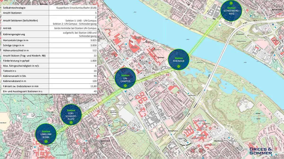 Die geplante Seilbahn soll auf einer Strecke von rund 3,8 Kilometern vom rechtsrheinischen Beuel über den Rhein bis hinauf zum Universitätsklinikum auf dem Venusberg führen. Insgesamt sind fünf Stationen vorgesehen. Ziel ist es, eine schnelle und staufreie Verbindung zu schaffen und insbesondere die stark belasteten Straßen in Richtung Venusberg zu entlasten.