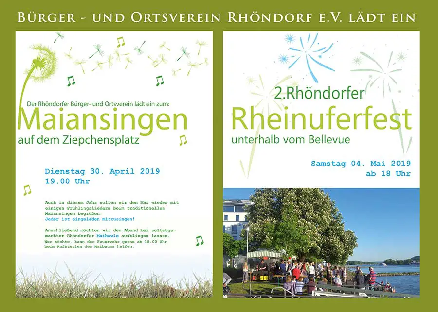 Bad Honnef-Rhöndorf – Der Bürger- und Ortsverein Rhöndorf lädt am 30.4.2019, 19 Uhr, zum Maiansingen auf dem Ziepchensplatz ein. Mitsingen erwünscht. Wer der Löschgruppe Rhöndorf beim Aufstellen des Maibaums helfen möchte, sollte bereits um 18 Uhr auf dem Ziepchensplatz sein.