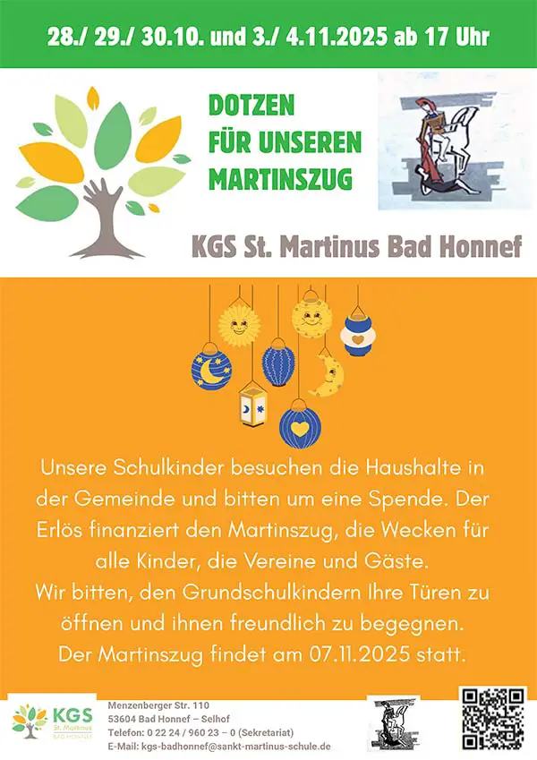 Bad Honnef-Selhof – Die Schulkinder der KGS St. Martinus dotzen am 28., 29. und 30.10.2025 sowie am 3. und 4.11.2025. Die Kinder besuchen die Haushalte in der Gemeinde und bitten um eine Spende. Der Erlös finanziert den Martinszug, die Wecken für alle Grundschul- und Kitakinder, die Vereine und Gäste. Ein weiterer Teil der Spenden kommt einem guten Zweck zugute.