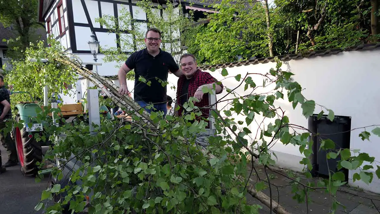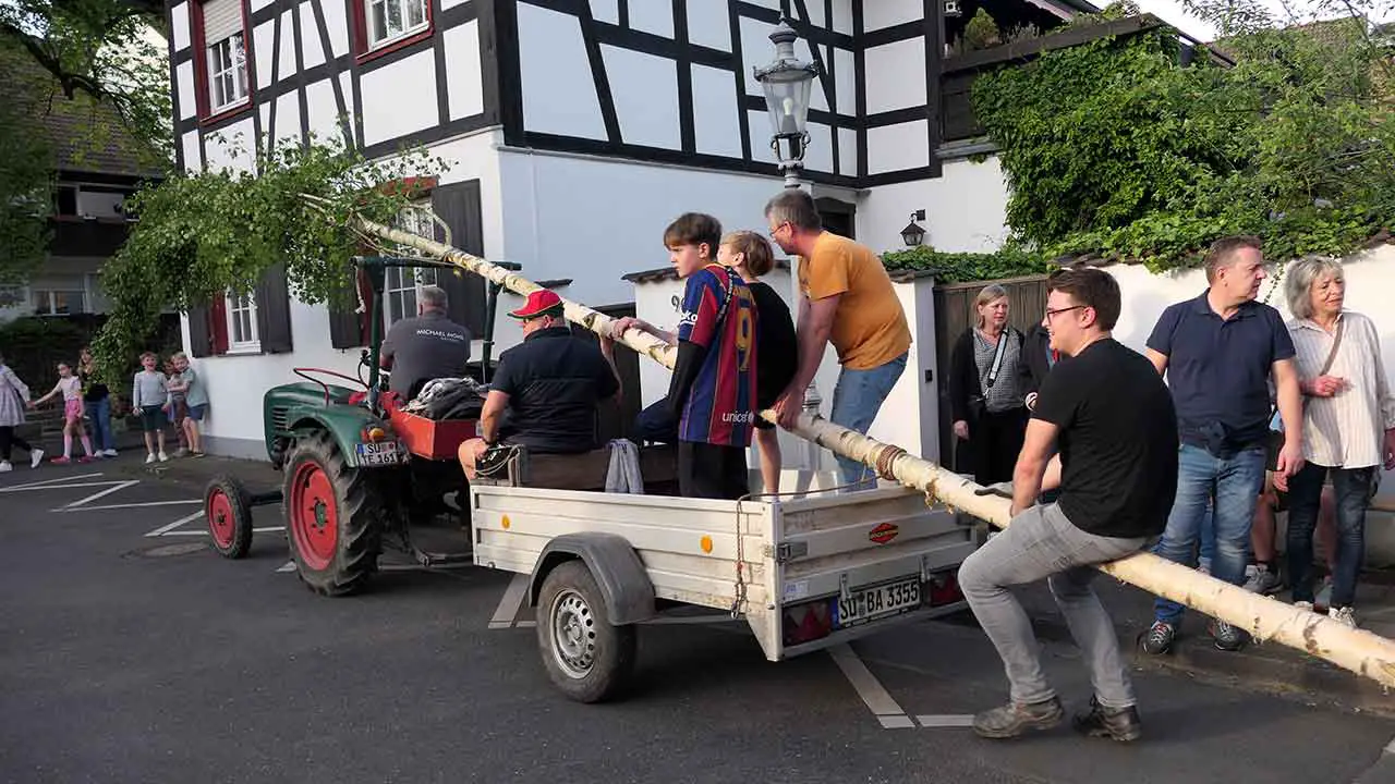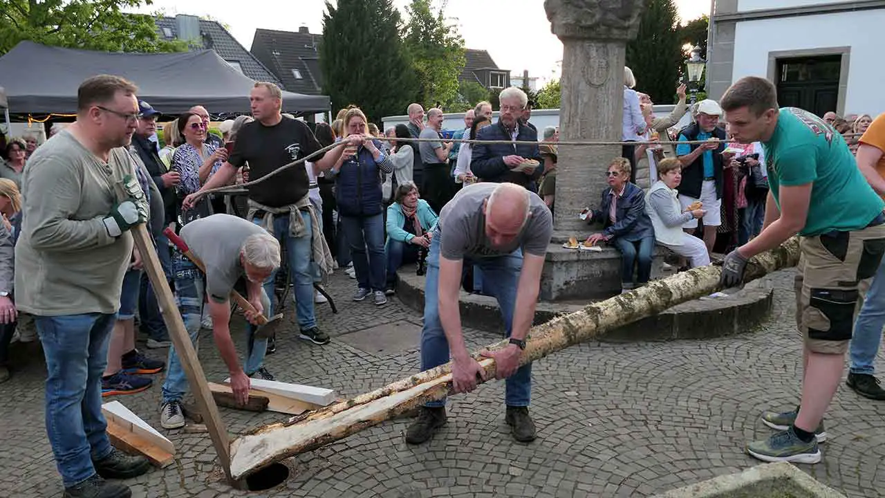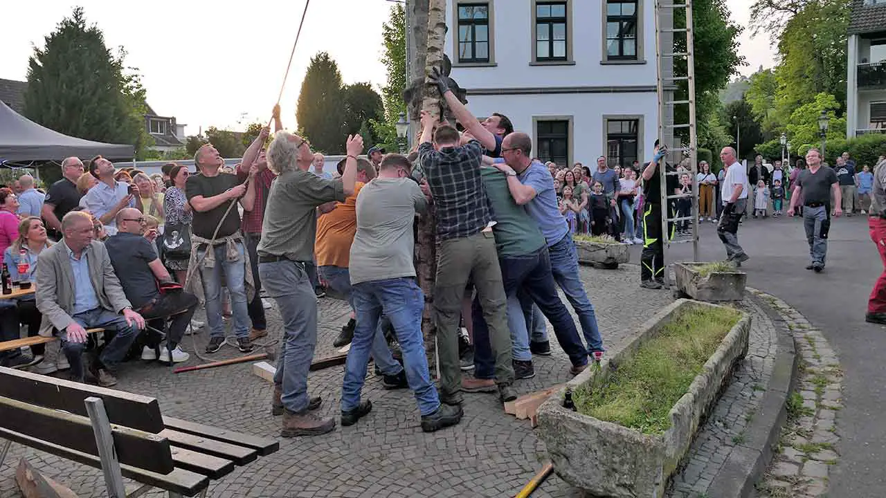 Bad Honnef – Traumwetter am Vorabend des 1. Mai. In den Veedeln wurden wieder unter großer Kraftanstrengung die Maibäume gesetzt. Wie hier auf dem Rommersdorfer Annaplatz ließen sich viele Bürgerinnen, Bürger und Gäste das Spektakel nicht entgehen. Nachdem die Bäume standen, ging es mit dem gemütlichen Teil weiter.