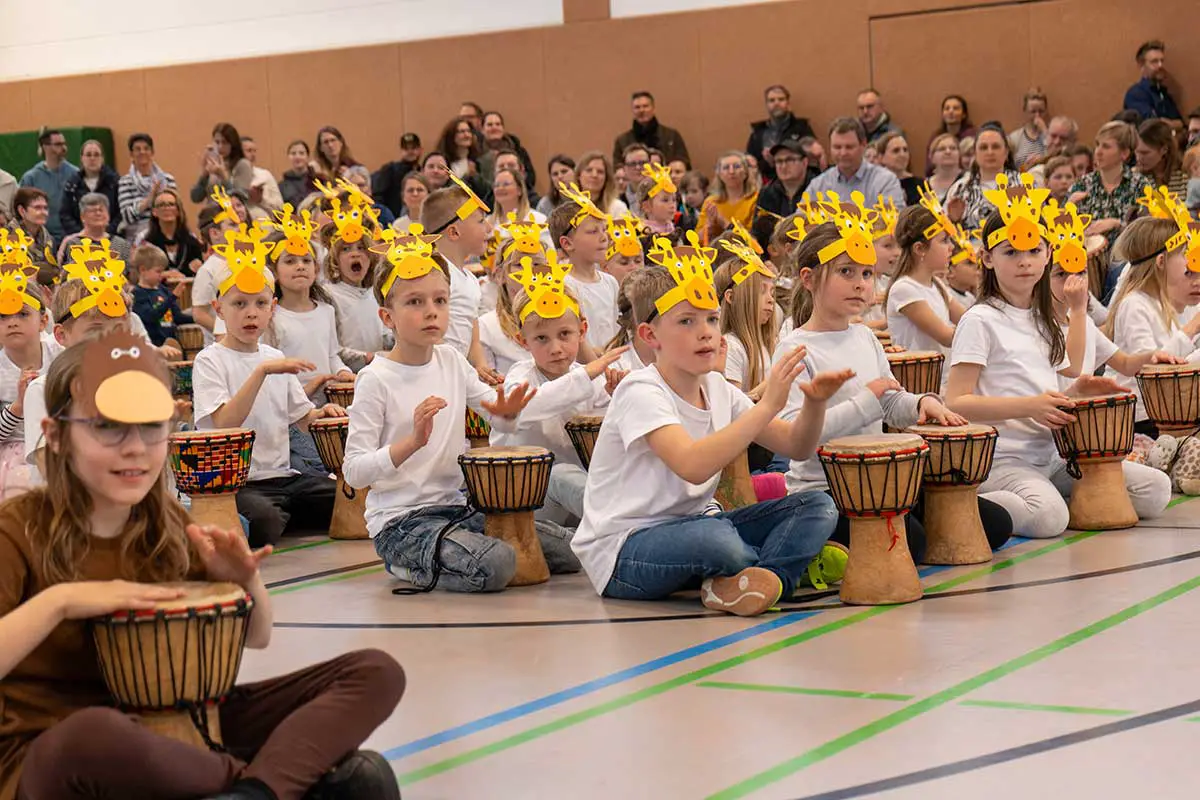 Bei der Aufführung zeigten alle Klassenstufen ihr Können auf ganz besondere Weise: Die Erstklässler tanzten als anmutige Gazellen, die Zweitklässler präsentierten sich als stolze Giraffen, die Drittklässler beeindruckten als kraftvolle Elefanten und die Viertklässler sorgten als lebhafte Affen für mitreißende Momente. Gemeinsam mit Lehrkräften und dem Team der Offenen Ganztagsschule (OGS) entstand mit über 300 Trommeln ein farbenfrohes, rhythmisches Gesamtbild, welches das Publikum begleitete.