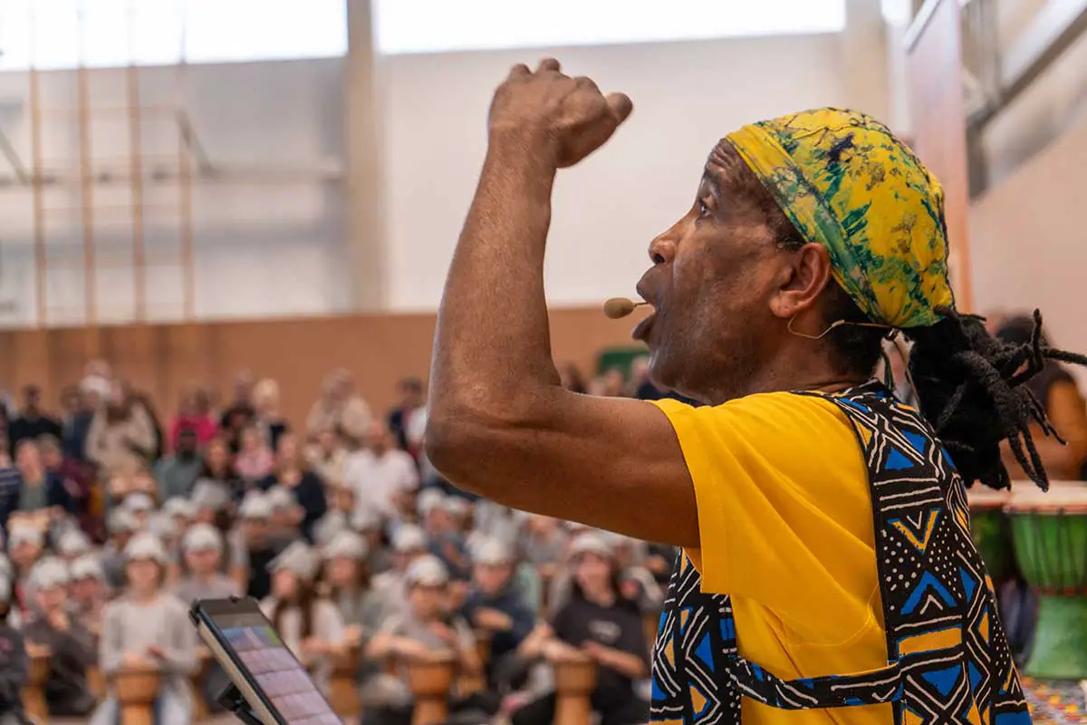 Höhepunkt der Projektwoche „Trommelzauber“ war die große Abschlussaufführung „Tambo Tambo“, auf die die Kinder die gesamte Woche über mit viel Begeisterung und Ausdauer hingearbeitet hatten. Täglich tauchten sie gemeinsam mit dem aus Togo stammenden Künstler Soukou in die Welt afrikanischer Trommelklänge ein. Am Ende der Woche wurde deutlich: Die jungen Teilnehmerinnen und Teilnehmer hatten nicht nur musikalisch enorme Fortschritte gemacht, sondern auch Selbstvertrauen und Gemeinschaftssinn gestärkt.